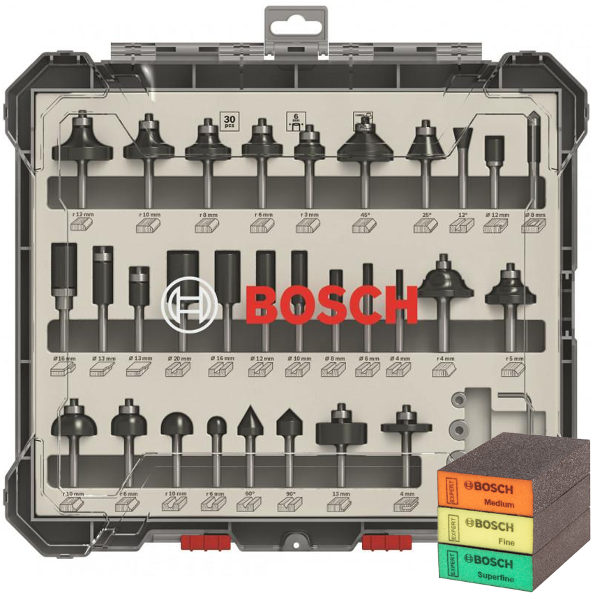 BOSCH Set 30 freze HM tija 6 mm + Set 3 bureti abrazivi EXPERT 69x98x26 mm (dur, mediu, fin)