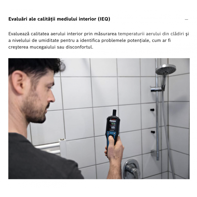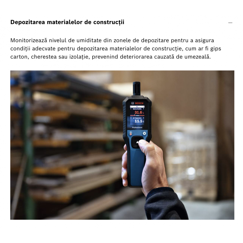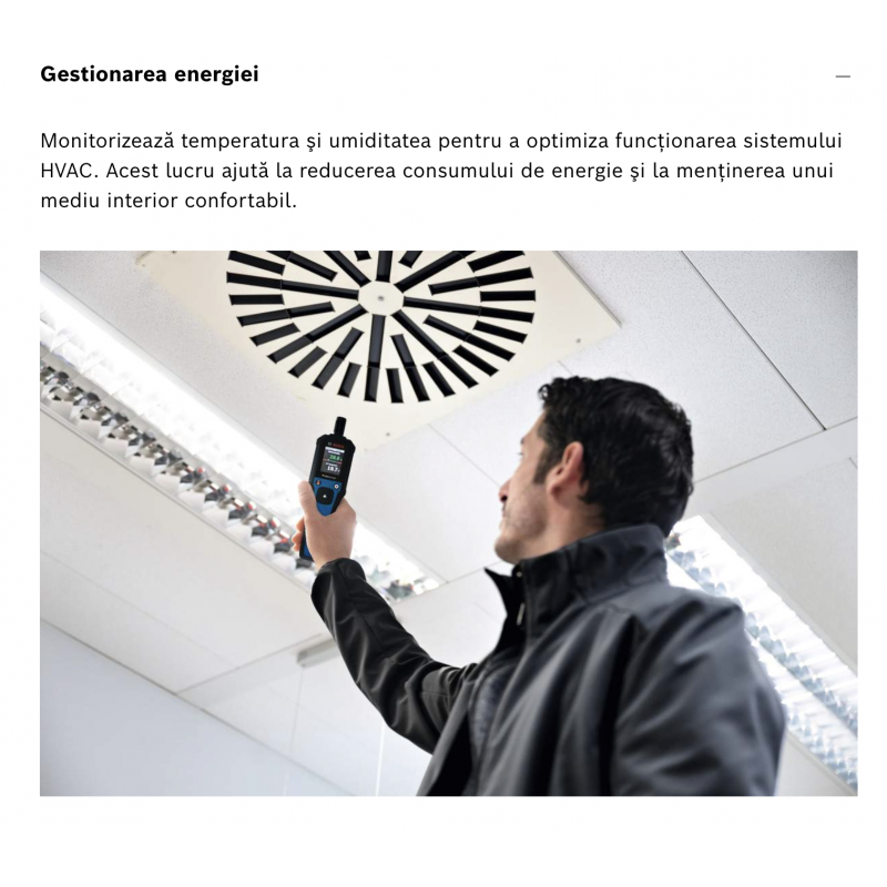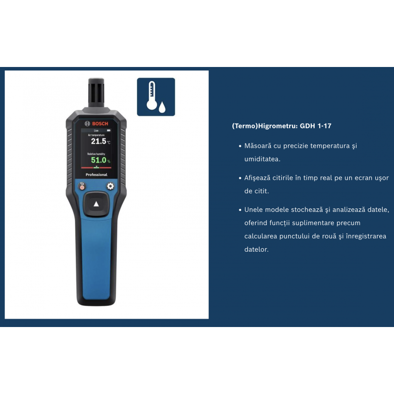 Promotii instrumente de masura BOSCH professional Camere de inspectie Clinometre digitale Detectoare de metale Goniometre digitale Higrometre/Termohigrometre Nivele laser cu linii Nivele laser rotative Nivele optice Roti de masurare Telemetre cu laser Termodetector si umidometru Testere electriceBOSCH GDH 1-17 Termohigrometru