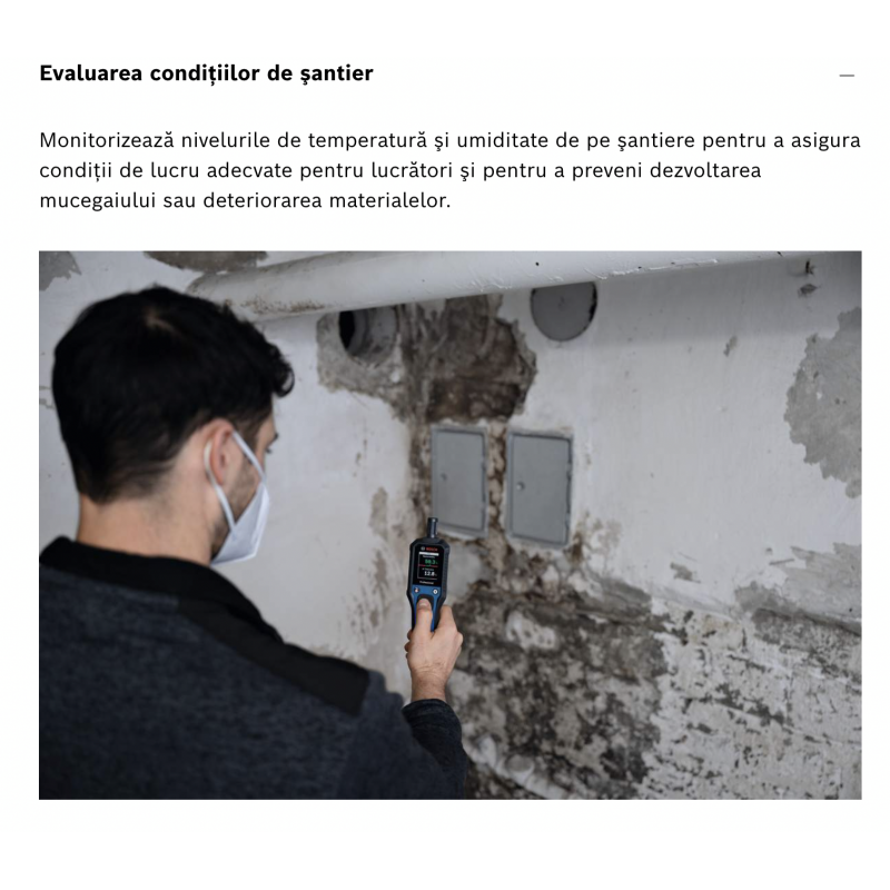 Termohigrometrul GDH 1-17 Professional este dispozitivul ideal pentru măsurători precise ale mediului. Oferă valori în timp real, minime și maxime, ale temperaturii aerului, umidității relative, punctului de condensare, temperaturii termometrului umed și umidității absolute pentru a te asigura că dispui de date exacte pentru proiectele tale. Ecranul LCD color cu contrast ridicat facilitează citirea măsurătorilor - chiar și în condiții de iluminare dificilă. Construit pentru șantierele dificile, designul său durabil are o carcasă din cauciuc și un grad de protecție IP65 pentru a rezista la praf și apă.