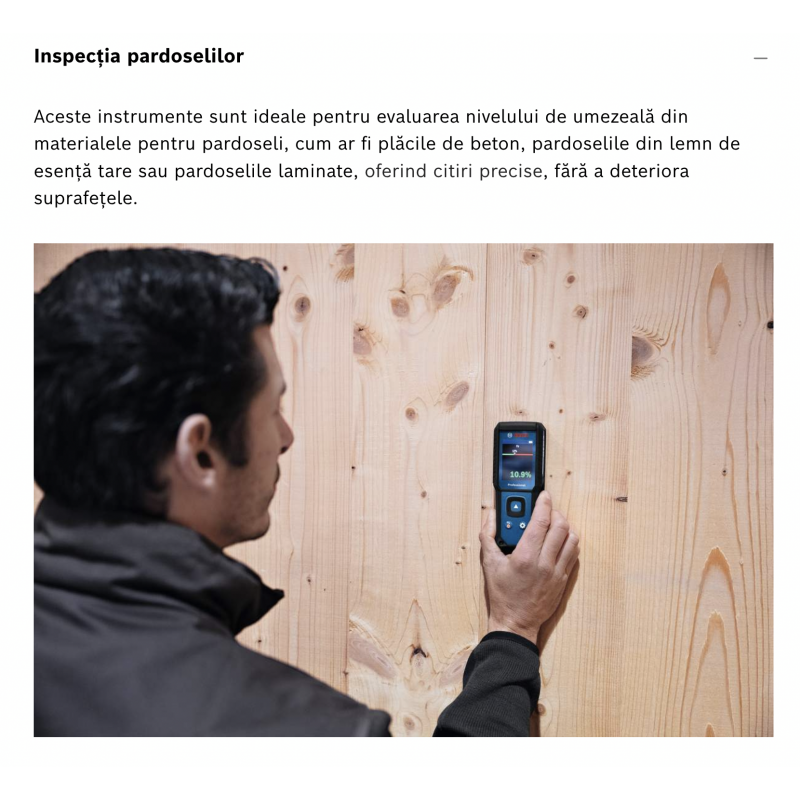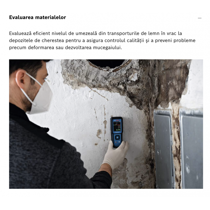 Aparatul de măsurare a umidităţii materialelor GMM 1-15 Professional este dispozitivul tău de bază pentru citiri rapide și precise ale umidității neinvazive (fără pini). Măsoară conținutul de umiditate în 37 de tipuri de lemn și 10 tipuri de materiale de construcție, afișând rezultate pe un ecran LCD color cu contrast ridicat. Scala de prag variabilă facilitează citirea rezultatelor, în timp ce modul de referință îţi permite să compari nivelurile de umiditate din diferite zone. Designul său robust, carcasa ranforsată din cauciuc și gradul de protecție IP65 asigură durabilitate pe șantierele dificile, oferindu-ţi o performanță fiabilă de fiecare dată - indiferent de condiții.