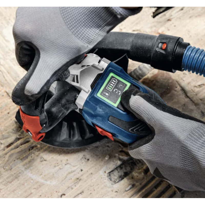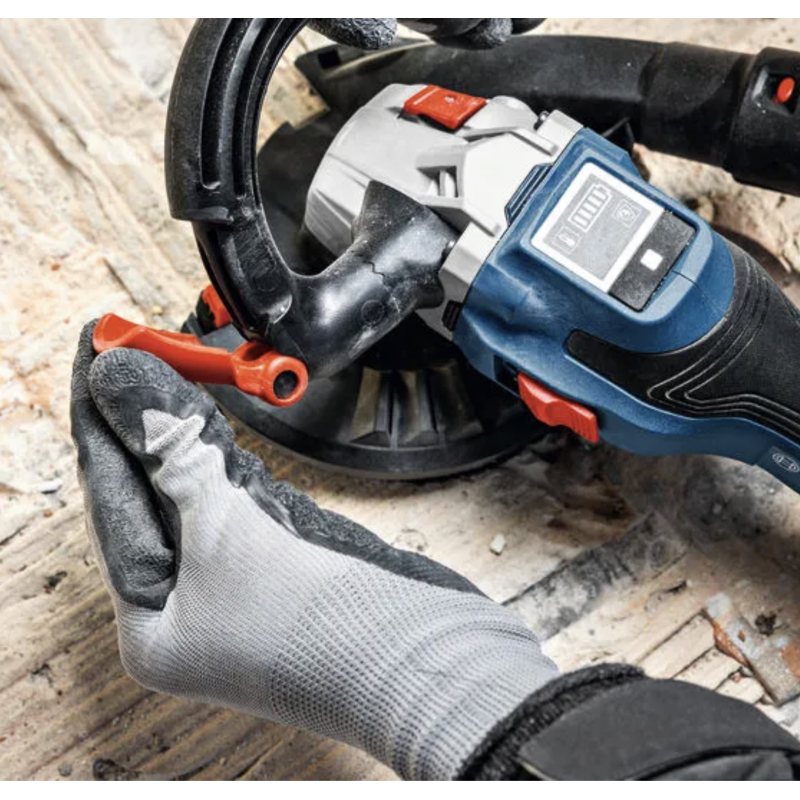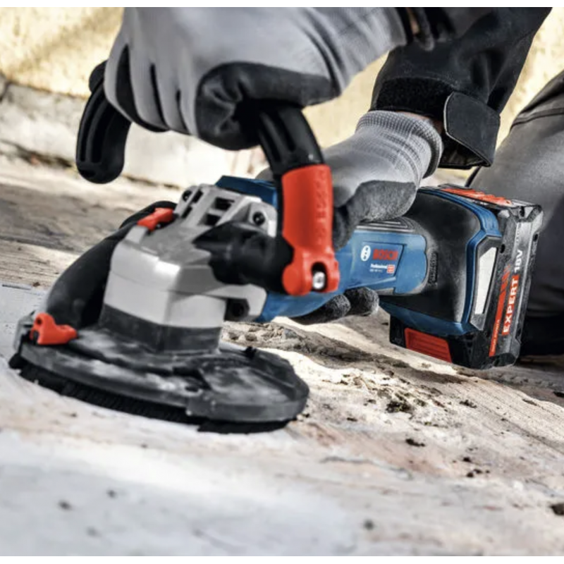 Şlefuitorul de beton Bosch GBR 18V-15 S Professional cu acumulator oferă eficienţă, fără a compromite puterea. Tehnologia motorului fără perii asigură o viteză excelentă de îndepărtare a materialului. Această sculă facilitează accesul la spaţii înguste datorită mânerului auxiliar rotativ. În plus, şlefuirea la nivel aproape de margine este realizată fără efort cu elementul de protecţie mobil. Acest şlefuitor de beton obţine rezultate profesionale pe o varietate de materiale datorită selecţiei vitezei prin HMI. Şi este conceput pentru a îmbunătăţi protecţia utilizatorului cu funcţii precum KickBack Control, Brake System şi Drop Control.