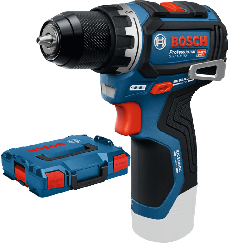 GSR 12V-32 Professional cu acumulator oferă cel mai bun control al sculei datorită tehnologiei Advanced KickBack Control. Această tehnologie minimizează riscul de rănire dacă un burghiu se blochează brusc sau chiar dacă scula se roteşte încet în jurul axei de găurire şi forţa de fixare creşte lent. Cu o lungime a capului de 142 mm și o înălțime a sculei de 160 mm, scula este extrem de compactă și facilitează găurirea sau înșurubarea, chiar și în spații înguste sau greu accesibile. În plus, munca repetitivă pe tot parcursul zilei este mai puțin obositoare cu această mașină de găurit şi înşurubat ușoară, cântărind doar 0,7 kg.